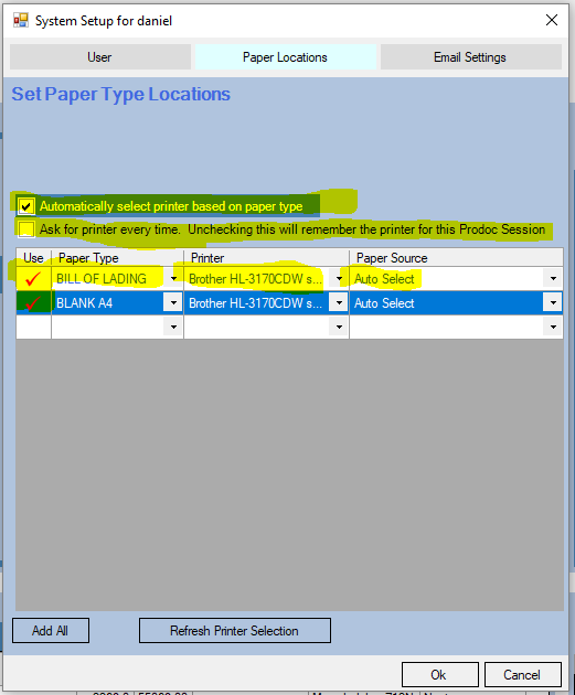 You can also choose whether Prodoc should automatically select the printer based on paper type, or whether you want to manually select the printer every time you print.