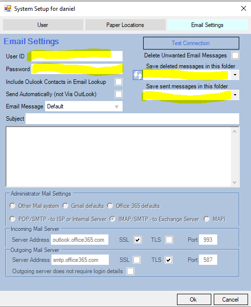 Configuration of non-Outlook email settings is found in Edit > System Configuration > User Details > Email Settings and you will need to seek IT assistance for which settings to use