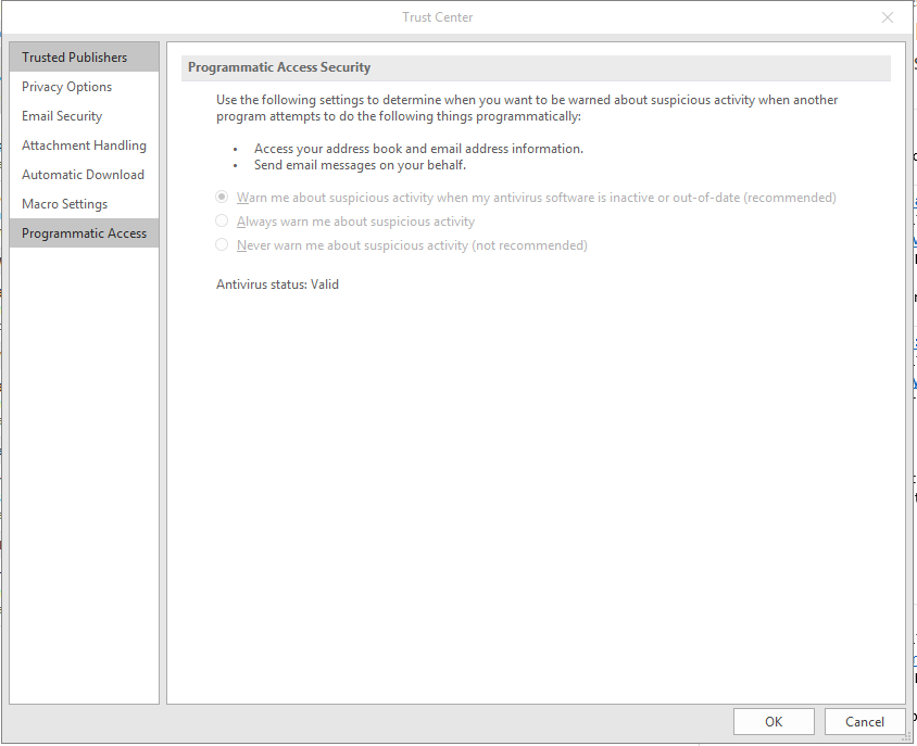 It’s likely that you’re running off a Terminal Server, unfortunately this is an Outlook restriction and set to automatically notify if it can’t detect an antivirus, which it cannot do on a terminal session (even if one is there). IT are capable of disabling it, based on their security policy, in the Outlook Trust Center under Programmatic Access.