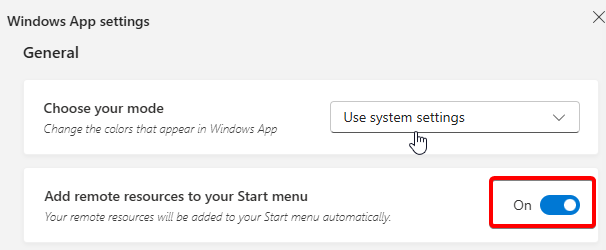 For easier access, you can use the Settings screen (button is at the bottom left of the Windows App) and then turn on the Add remote resources to your Start menu option as shown below: